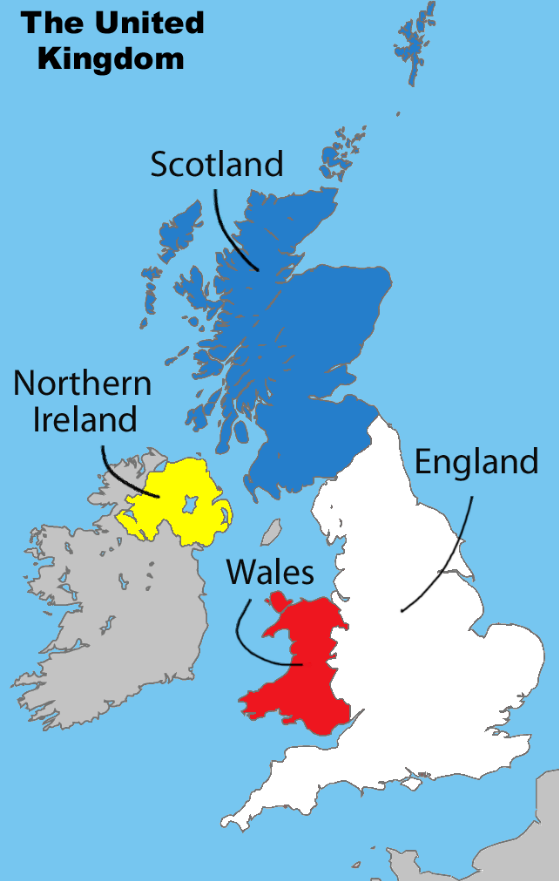 영국은 유럽의 서북쪽 그레이트 브리튼 섬에 위치하고 있는 잉글랜드"England"와 스코틀랜드"Scotland", 웨일스"Wales", 그리고 아일랜드 섬 북쪽의 북아일랜드"Northern Ireland"로 이루어진 섬나라이다