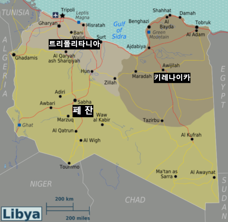 리비아의 국토는 지형적으로 각각의 특징을 갖는 트리폴리타니아"Tripolitania"(서부), 키레나이카"Cyrenaica"(동부), 페잔"Fezzan"(남부)으로 구성됩니다.