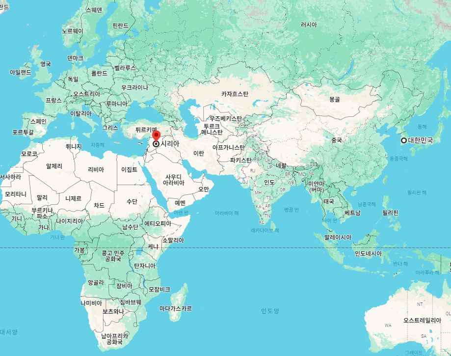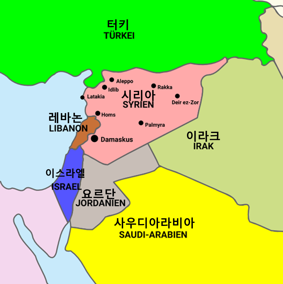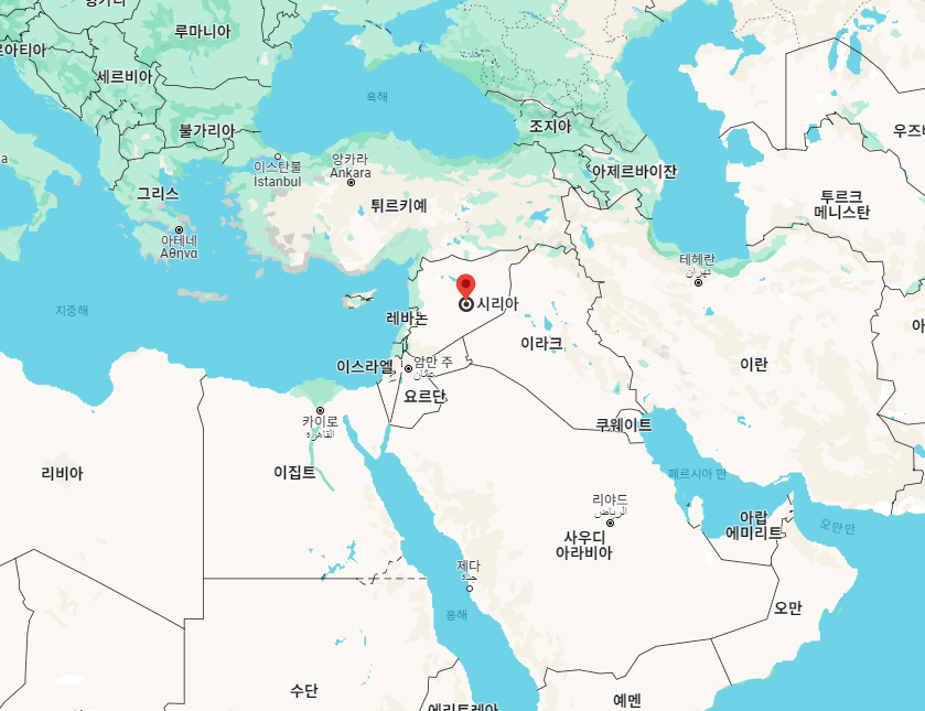 시리아"Syria"는 아시아 남서쪽, 지중해 동부 연안에 있는 국가로 북쪽으로는 터키, 동쪽으로는 이라크, 서쪽으로는 레바논과 지중해, 그리고 남쪽으로는 요르단, 이스라엘과 접해있습니다.