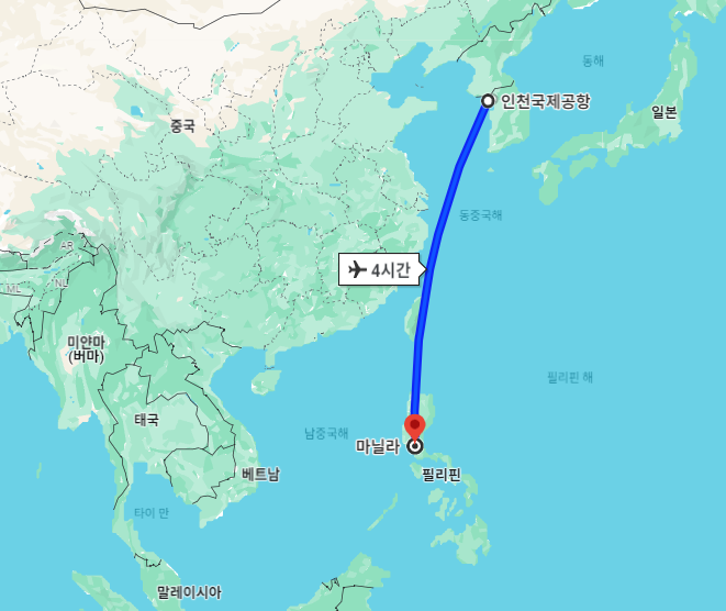 대한민국에서 필리핀까지의 거리는 약 2,628km이며 인천국제공항에서 필리핀 수도 마닐라"Manila"까지의 비행시간은 약 4시간, 시차는 대한민국 기준 1시간 느립니다.