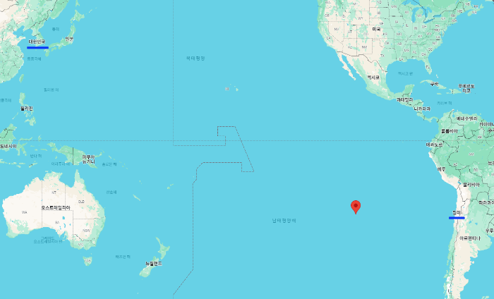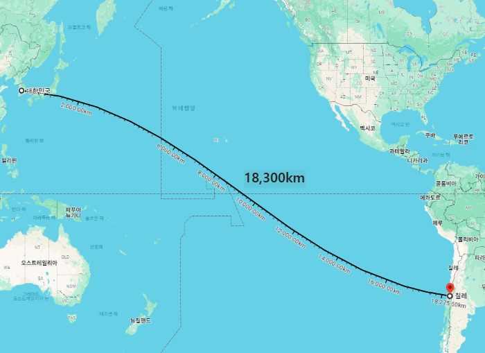 대한민국 기준으로 칠레까지의 거리는 약 18,300km이며 시차는 12시간 느립니다.