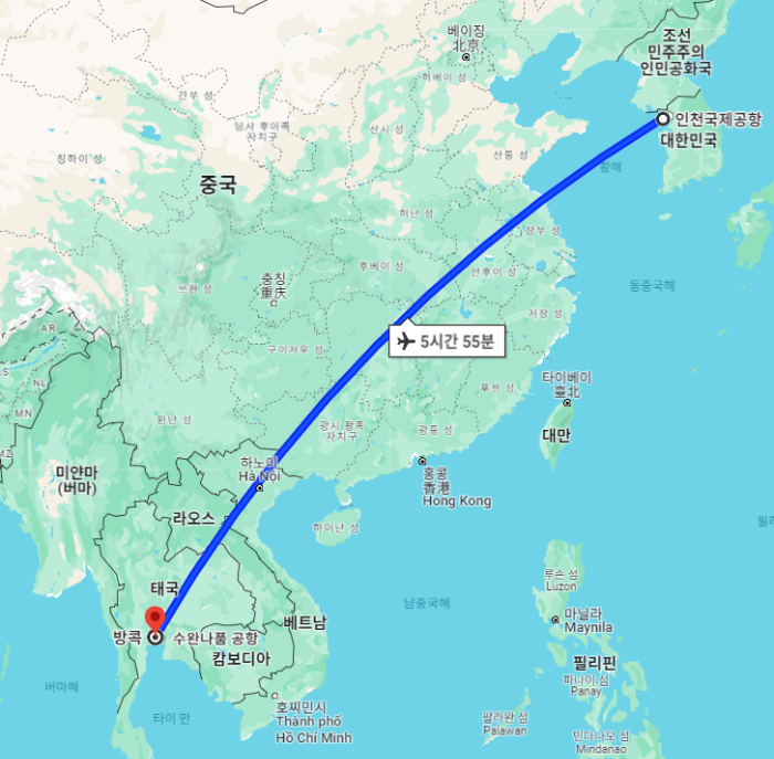 대한민국을 기준으로 태국까지의 거리는 약 3,460km, 시차는 2시간 느리며, 비행시간은 방콕 수완나품국제공항 직항 기준 약 5시간 50분 내외입니다.
