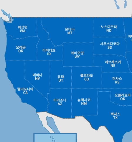 산악: 와이오밍주(WY), 몬태나주(MT), 아이다호주(ID), 콜로라도주(CO), 뉴멕시코주(NM), 유타주(UT), 애리조나주(AZ), 네바다주(NV)