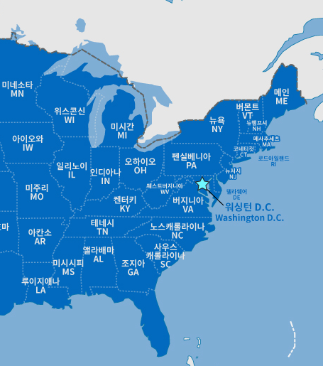 남부: 플로리다주(FL), 조지아주(GA), 사우스캐롤라이나주(SC), 노스캐롤라이나주(NC), 웨스트버지나아주(WV), 버지니아주(VA), 메릴랜드주(MD), 델라웨어주(DE)