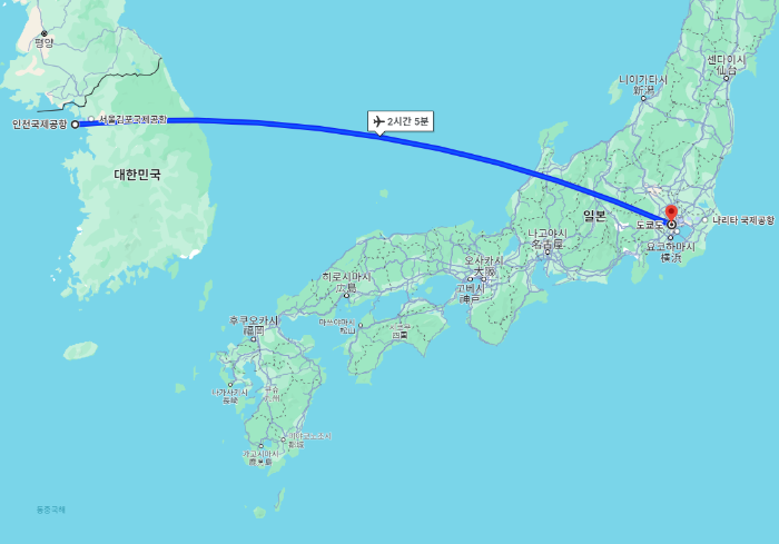 대한민국 서울을 기준으로 도쿄까지의 거리는 약 1,147km이며 인천국제공항에서 도쿄 나리타공항(NRT)까지의 비행시간은 최소 2시간 5분이며 시차는 없습니다.