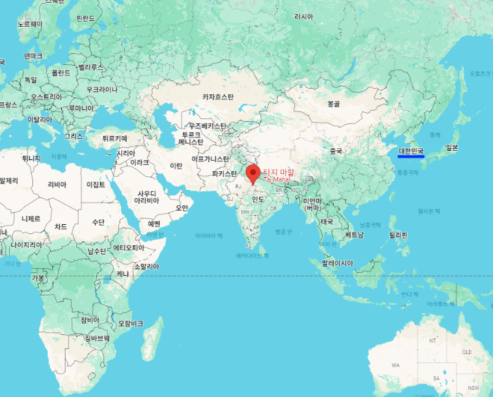 대한민국 서울을 기준으로 인도의 "타지마할"까지의 거리는 약 4770km이며 시차는 인도가 3시간 30분 느립니다.
