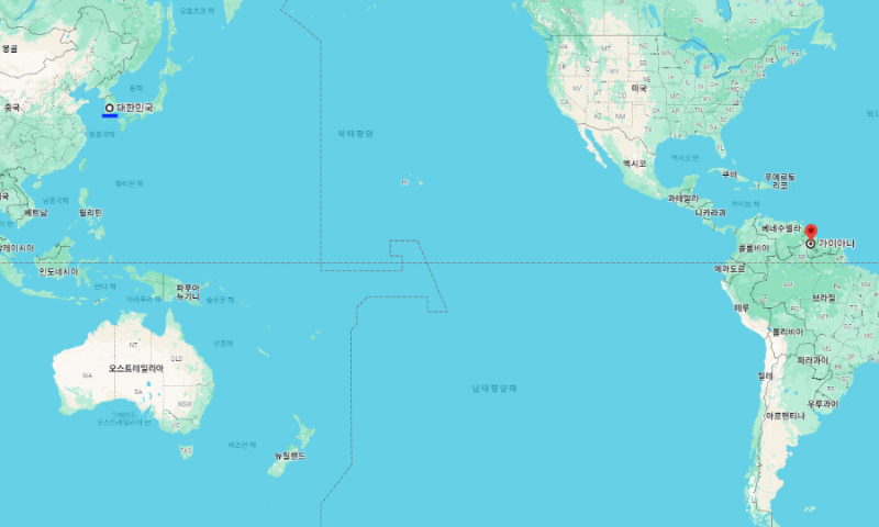 대한민국 기준으로 "가이아나"까지의 거리는 약 15,419km이며 시차는 가이아나가 13시간 느립니다.