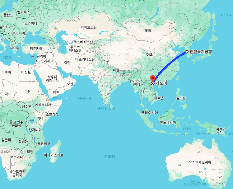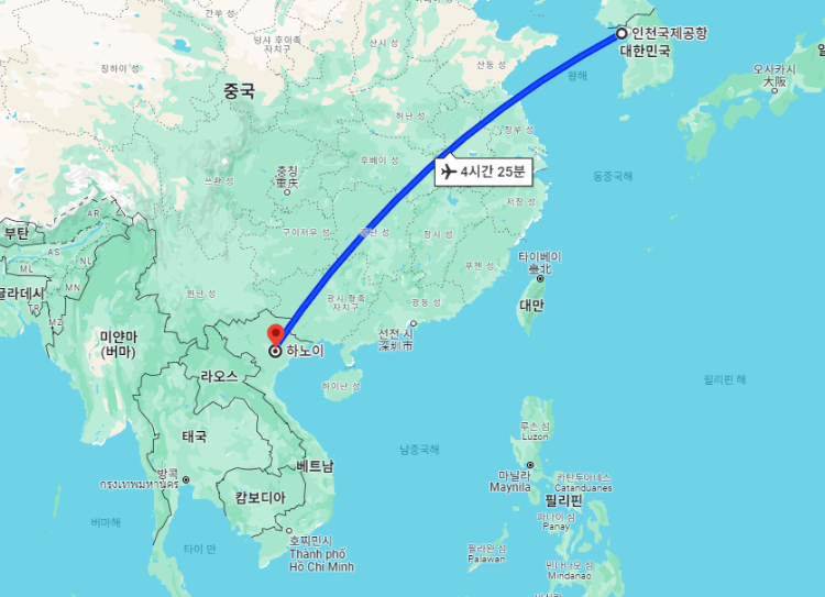 대한민국 기준으로 베트남까지의 거리는 약 3,109km, 비행시간은 하노이 노이바이(HAN) 도착 기준 최소 4시간 25분, 시차는 베트남이 2시간 느립니다.