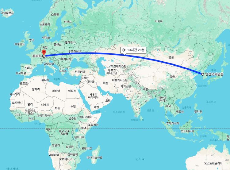 대한민국 기준으로 스위스까지의 거리는 약 9,014km이며 스위스의 최대 도시 취리히(ZRH)까지의 직항 비행시간은 최소 13시간 20분, 시차는 스위스가 7시간 느립니다.