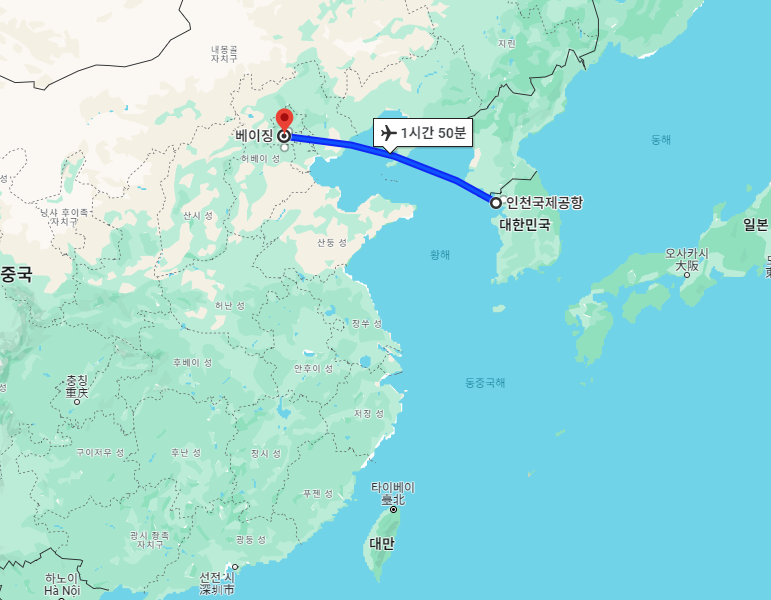 대한민국 서울을 기준으로 중국 수도 베이징까지의 거리는 약 953km이며 인천공항 출발 베이징(PEK)까지의 비행시간은 최소 1시간 50분입니다.