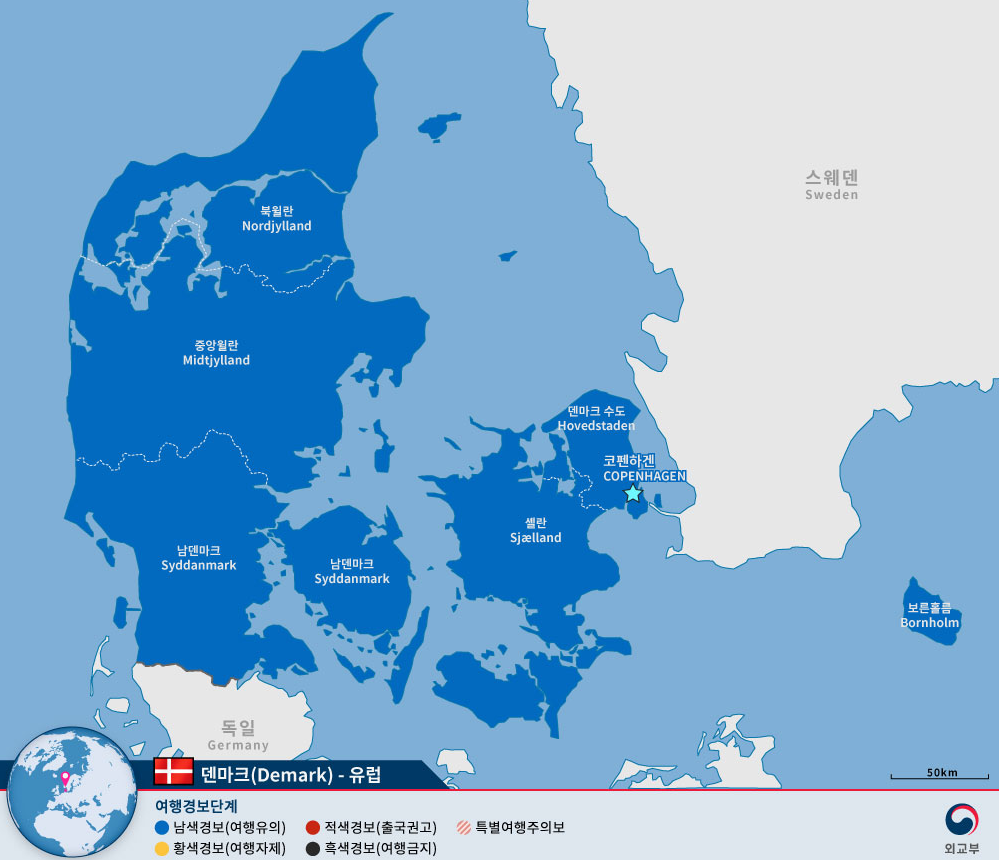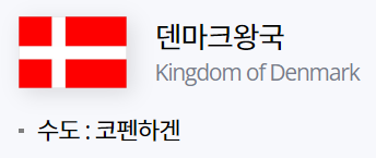 "덴마크"는 유럽 북쪽의 유틀란트 반도와 동쪽 해상의 부속 도서로 이루어진 입헌군주국으로 정식 국명은 덴마크왕국"Kingdom of Denmark"입니다.