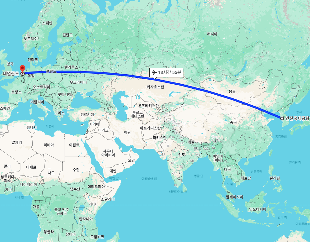대한민국 기준으로 네덜란드까지의 거리는 약 8,745km이며, 네덜란드 스히폴공항(AMS) 도착 기준 비행시간은 최소 약 13시간 55분 내외, 시차는 대한민국이 7시간 빠릅니다.