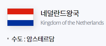 "네덜란드"는 유럽 서부에 위치하고 있는 입헌군주제 국가로 공식 국명은 네덜란드왕국"Kingdom of the Netherlands"입니다.