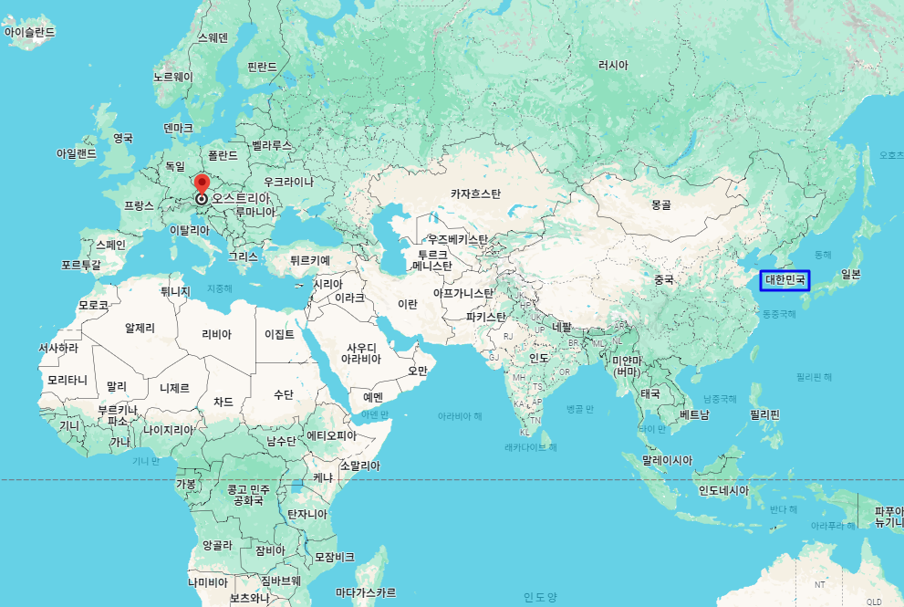 대한민국 기준으로 오스트리아까지의 거리는 약 8,609km이며, 비행시간은 비엔나(VIE) 직항 도착 기준 최소 약 12시간 30분 내외, 시차는 대한민국이 7시간 빠릅니다.