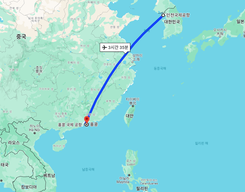 대한민국 기준으로 홍콩까지의 거리는 약 2,000km이며, 비행시간은 직항 기준 최소 3시간 35분, 시차는 홍콩이 1시간 느립니다.