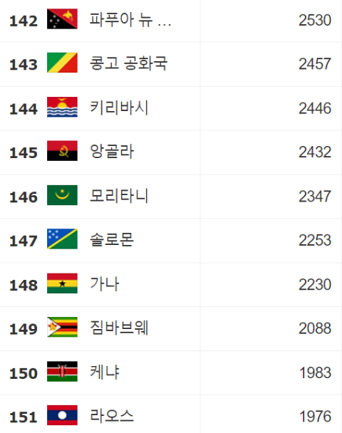 1인당 GDP 순위 142∽151: