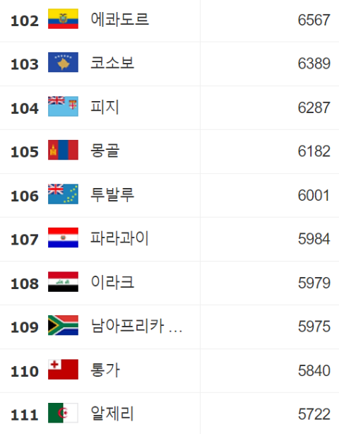 1인당 GDP 순위 102∽111: