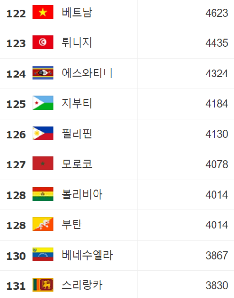 1인당 GDP 순위 122∽131: