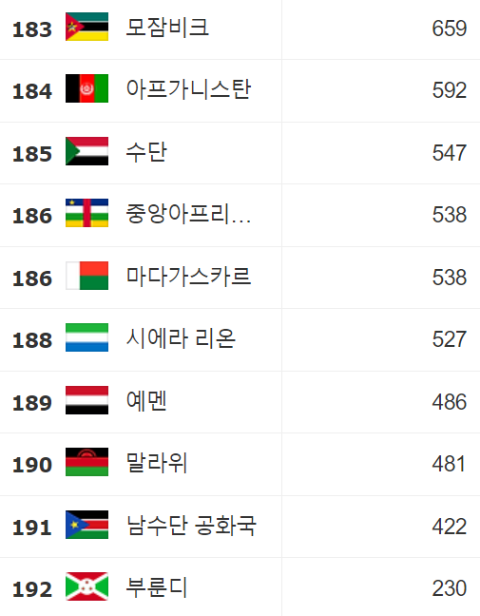 1인당 GDP 순위 183∽192: