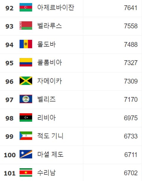 1인당 GDP 순위 92∽101: