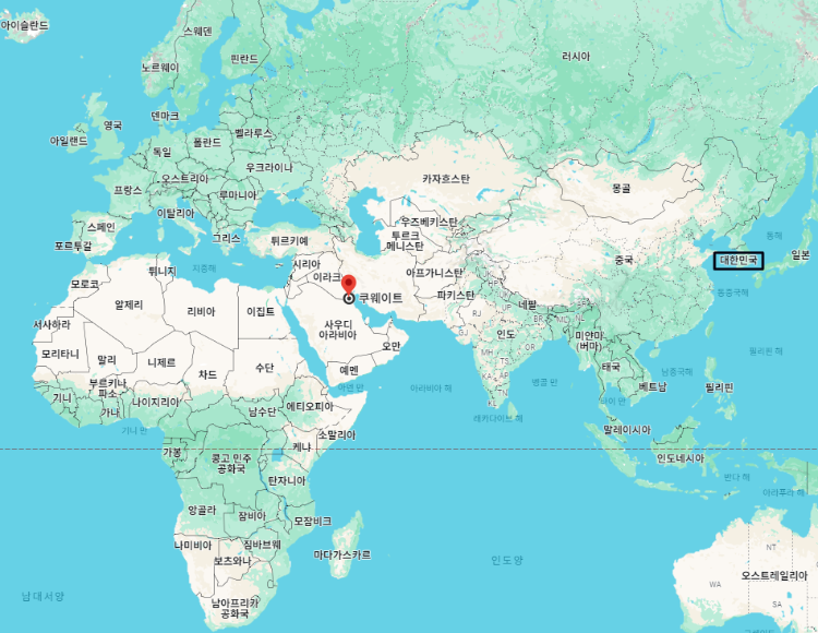 대한민국 기준으로 쿠웨이트까지의 거리는 7,337km이며, 시차는 쿠웨이트가 6시간 느립니다.