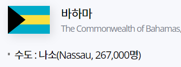 바하마 면적은 약 1만 3880㎢(한반도의 1/16)으로 세계 159위, 인구는 약 41만 5223명으로 세계 176위, 수도는 나소"Nassau"입니다.