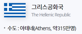 그리스"Greece"는 유럽의 남동부 발칸반도 남단에 위치하고 있는 국가로 공식 국명은 그리스공화국"The Hellenic Republic"입니다.