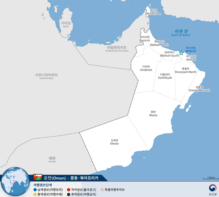 오만 면적은 약 30만 9500㎢(한반도의 1.4배)으로 세계 70위, 인구는 약 471만 명으로 세계 126위, 수도는 무스카트"Muscat"입니다.