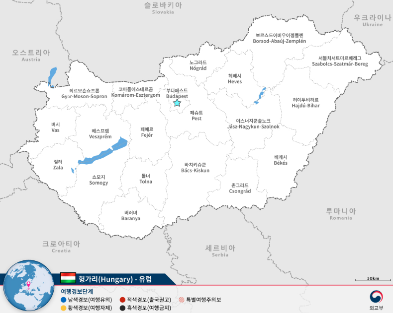 헝가리 면적은 약 9만 3030㎢(한반도의 2/5)으로 세계 111위, 인구는 약 999만 명으로 세계 94위, 수도는 부다페스트"Budapest"입니다.