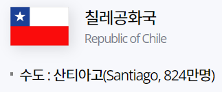 칠레 면적은 약 75만 6700㎢(한반도의 3.5배)으로 세계 37위, 인구는 약 1966만 명으로 세계 65위, 수도는 산티아고"Santiago"입니다.