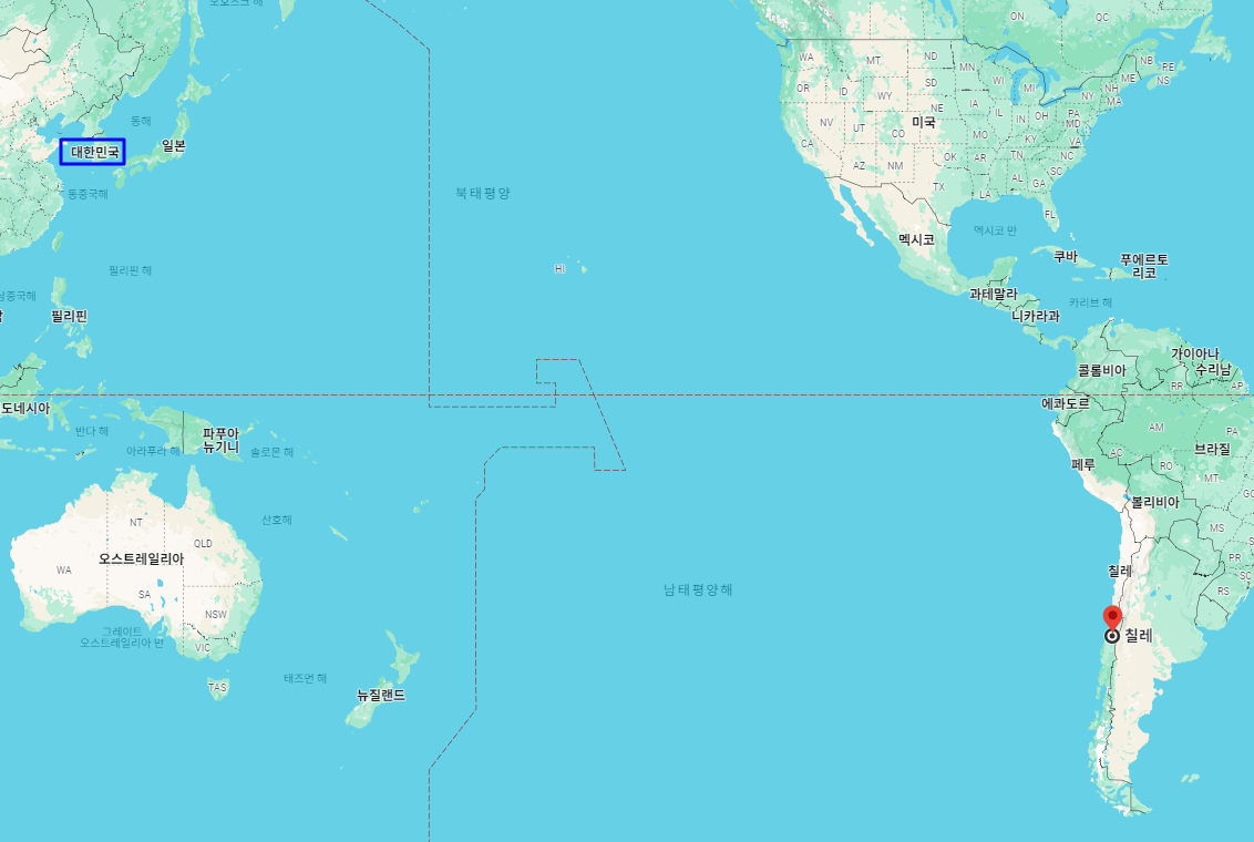 대한민국 기준으로 칠레까지의 거리는 약 18,265km이며, 시차는 대한민국이 13시간 빠릅니다.