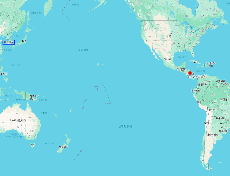 대한민국 기준으로 코스타리카까지의 거리는 약 13,950km이며, 시차는 코스타리카가 15시간 느립니다.