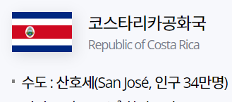 코스타리카"Costa Rica"는 중앙아메리카 남부, 태평양과 카리브해를 끼고 있는 국가로 공식 국명은 코스타리카공화국"Republic of Costa Rica"입니다.