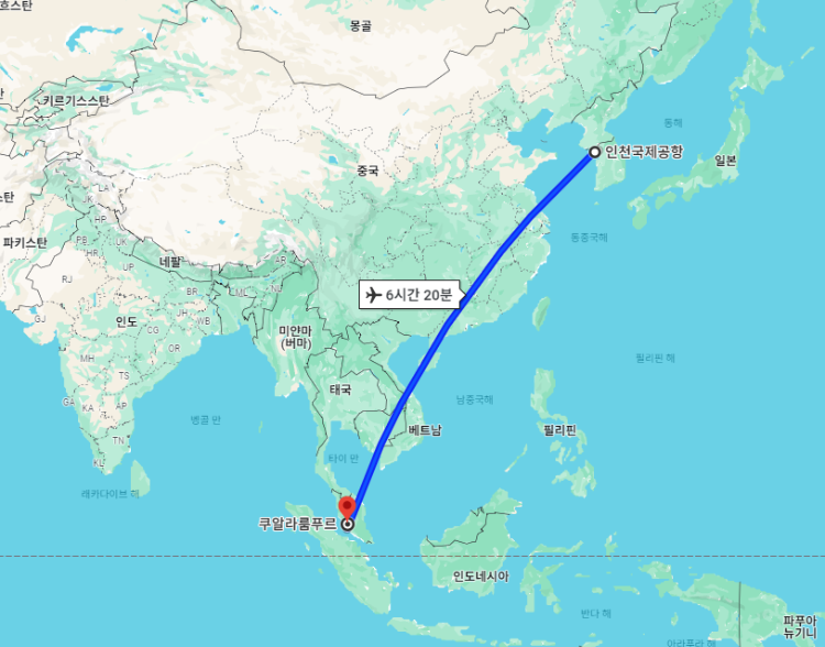 대한민국 기준으로 말레이시아 수도 쿠알라룸푸르까지의 거리는 약 4,520km이며, 비행시간은 쿠알라룸푸르공항(KUL) 도착 기준 최소 6시간 20분, 시차는 대한민국이 1시간 빠릅니다.