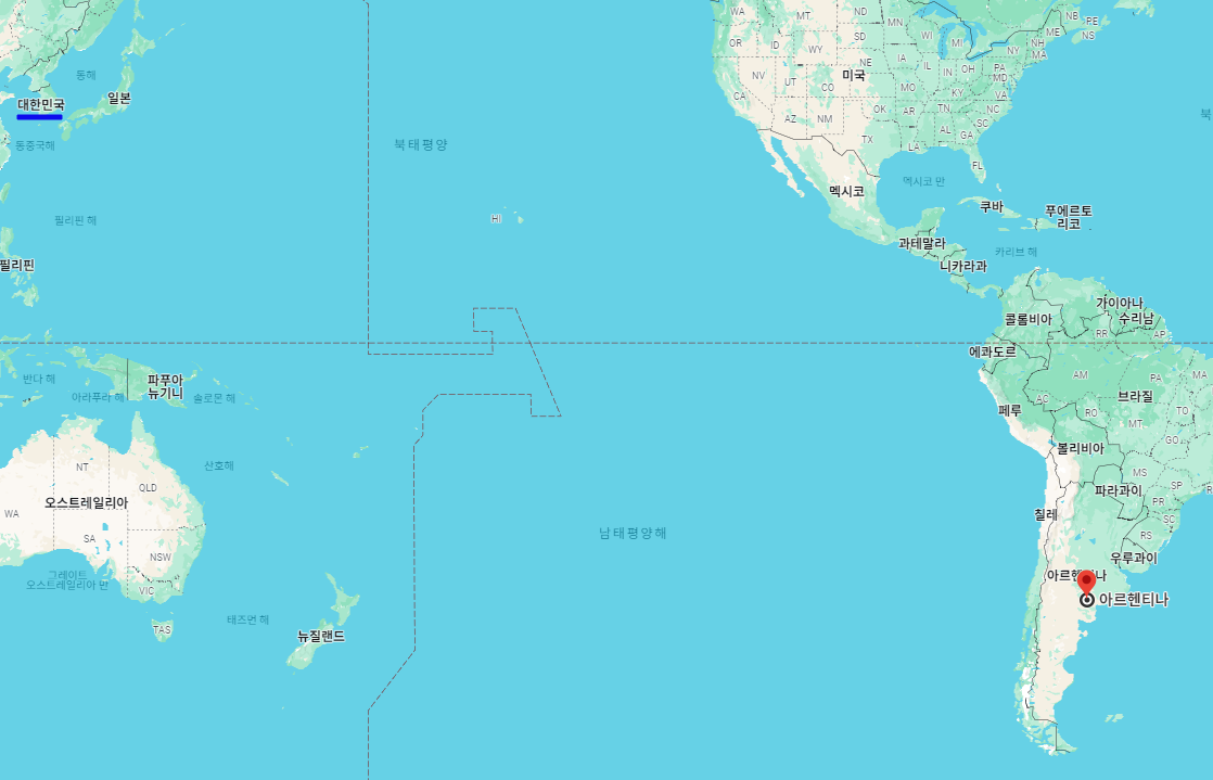 대한민국 기준으로 아르헨티나까지의 거리는 약 18,957km이며, 시차는 아르헨티나가 12시간 느립니다.