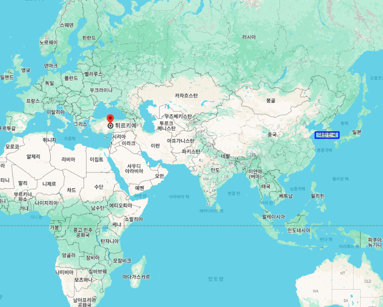대한민국 기준으로 튀르키예 수도 "앙카라"까지의 거리는 약 7,905km이며, 시차는 튀르키예가 6시간 느립니다.