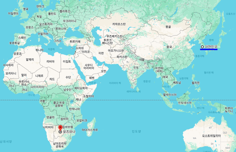 대한민국 기준으로 보츠와나까지의 거리는 약 12,569km이며, 시차는 보츠와나가 7시간 느립니다.