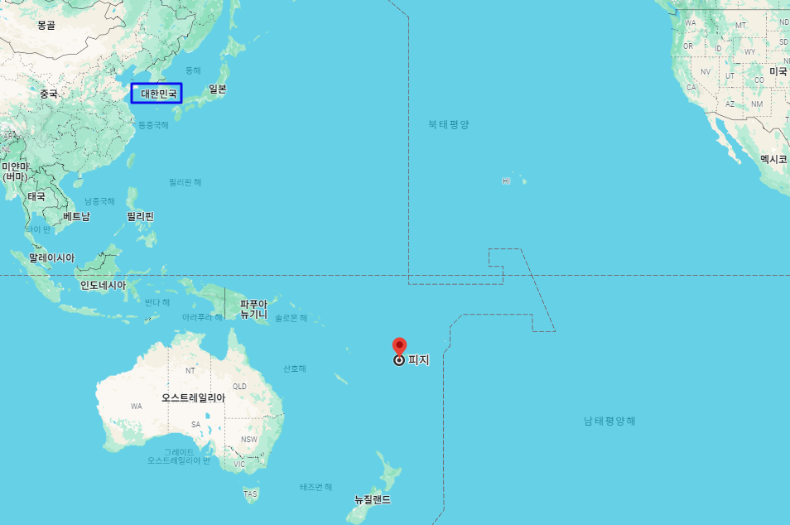 대한민국 기준으로 피지 수도 "수바"까지의 거리는 약 8,025km이며, 시차는 피지가 3시간 빠릅니다.