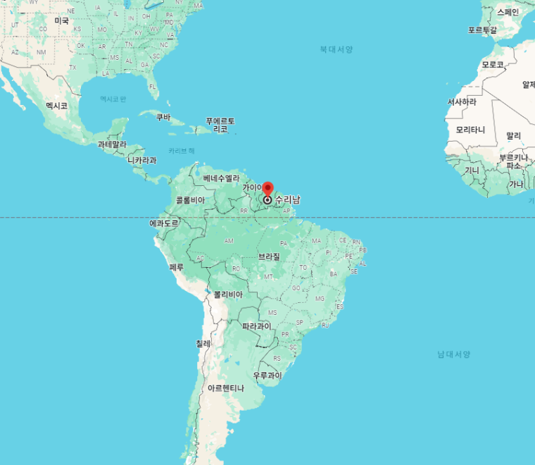 "수리남"은 남아메리카 동북부 대서양연안에 위치하고 있는 국가로 공식 국명은 수리남공화국"Republic of Suriname"입니다.