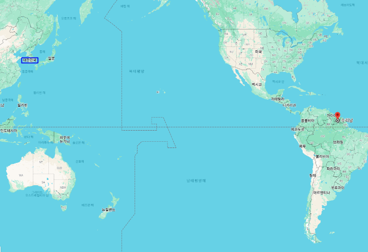 대한민국 기준으로 수리남 수도 "파라마리보"까지의 거리는 약 15,352km이며, 시차는 수리남이 12시간 느립니다.