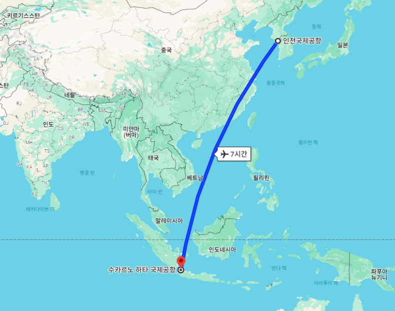 대한민국 기준으로 인도네시아 수도 "자카르타"까지의 거리는 약 5,164km이며, 비행시간은 수카르노하타공항(CGK) 직항 도착 기준 최소 7시간, 시차는 인도네시아가 2시간 느립니다.