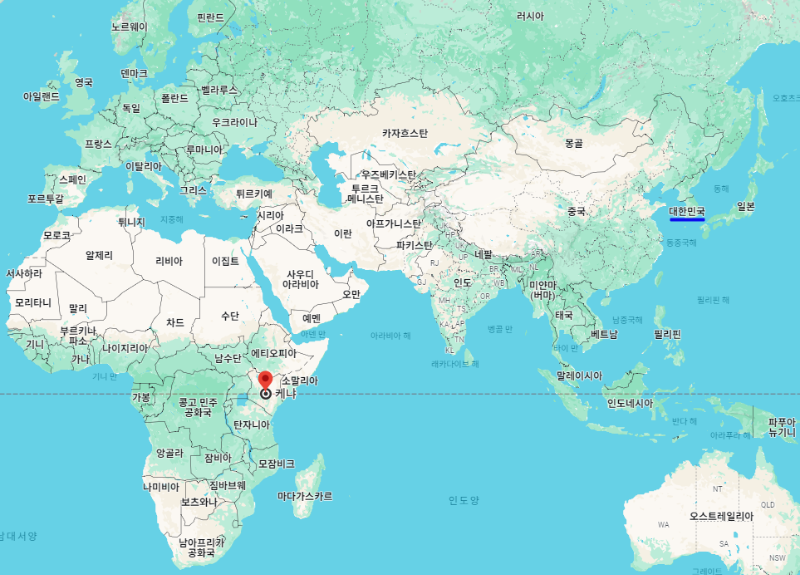 대한민국 기준으로 케냐 수도 "나이로비"까지의 거리는 약 11,171km이며, 시차는 케냐가 6시간 느립니다.
