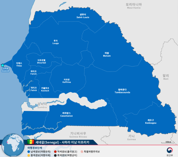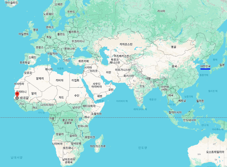 대한민국 기준으로 세네갈 수도 "다카르"까지의 거리는 13,295km이며, 시차는 세네갈이 9시간 느립니다.