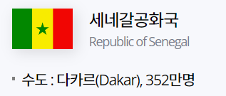 세네갈 면적은 19만 6710㎢(한반도의 0.9배)으로 세계 87위, 인구는 약 1822만 명으로 세계 71위, 수도는 다카르"Dakar"입니다.