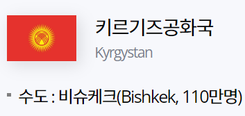 키르기스스탄"Kyrgyzstan"은 아시아 대륙의 중앙 북부에 위치하고 있는 국가로 공식 국명은 키르기즈공화국"Kyrgyz Republic"입니다.