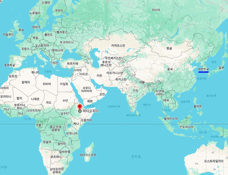 대한민국 기준으로 에티오피아 수도 "아디스아바바"까지의 거리는 약 9,327km이며, 시차는 에티오피아가 6시간 느립니다.