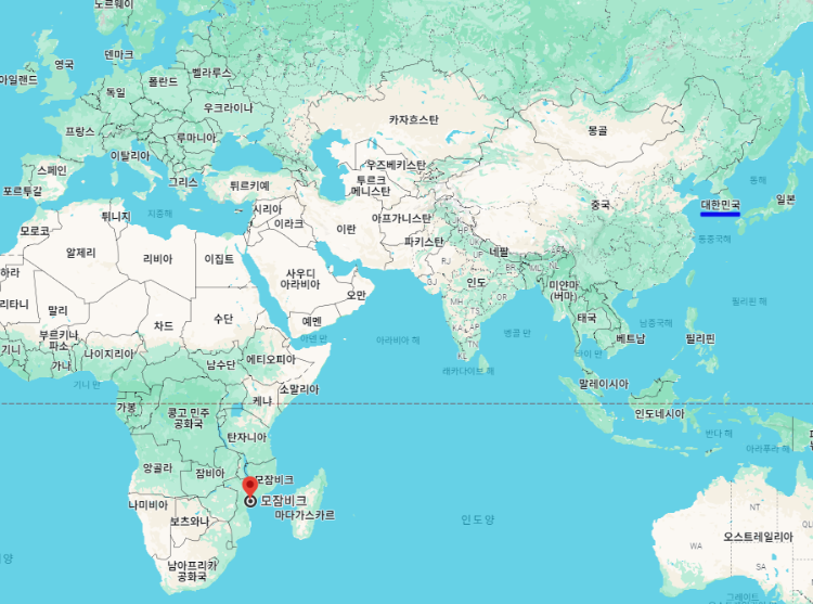 대한민국 기준으로 모잠비크 수도 "마푸투"까지의 거리는 약 12,094km이며, 시차는 모잠비크가 7시간 느립니다.