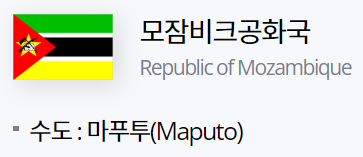 "모잠비크"는 아프리카 대륙의 남동부 인도양 연안에 위치하고 있는 국가로 공식 국명은 모잠비크공화국"Republic of Mozambique"입니다.