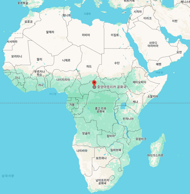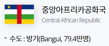 중앙아프리카공화국"Central African Republic"은 아프리카 대륙의 중앙에 위치하고 있는 내륙국으로 수도는 방기"Bangui"입니다.