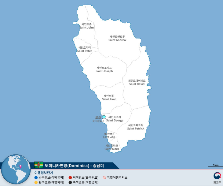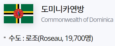 도미니카연방"Commonwealth of Dominica"은 중앙아메리카 카리브해에 위치하고 있는 도서국가로 수도는 로조"Roseau"입니다.